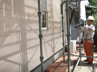 - 塗膜劣化で全体的にチョウキングで白っぽくなっています。 ただの塗替えでなく外壁を塗り壁にしてみました。 コテ塗り壁でとても可愛らしく仕上がりました。